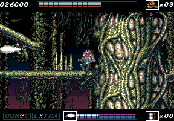 As Saul, it is your job to traverse five different areas on your way to Draxx. When Saul collects enough power-ups, he turns into his wolf form and gains a special psychic shot attack, which can be improved by collecting further power-ups. However, if Saul loses health, he turns back into his human form and only has his fists to fight the numerous enemies.