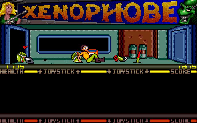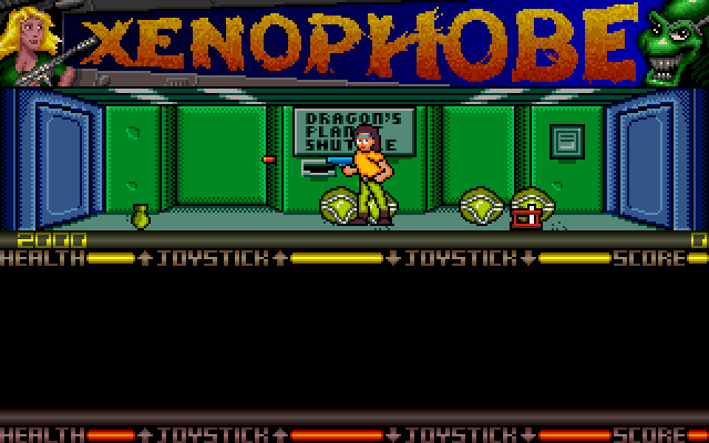 Xenophobe is a side-scrolling shooter with platform elements. Assemble your band of engineers and fight the Xenos on each station, striving to either clear it or abandon it. You start out with a standard issue laser, but can pick up additional weapons as you find them, including Phasers, Lightning Rifles, Poofer guns, and bombs.