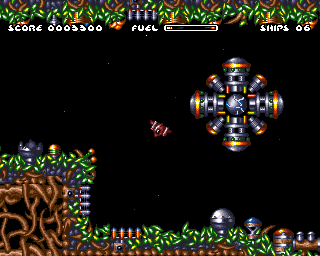 Zarathrusta is a cave-flying game influenced by Thrust. Apparently, the resistance forces have captured a number of space ships, which could aid in the struggle against the empire. However, these ships need fuel, and that fuel is find in the form of "klystron pods", which must be recovered from a range of hostile environments. Your task is to fly your small spaceship above and below ground, capturing the pods. Your spaceship can rotate in 360 degrees, allowing for easy movements through the cave systems, if it wasn't for gravity pulling you down, and inertia, which means you could crash into walls or other objects if you don't turn around and thrust in the other direction.