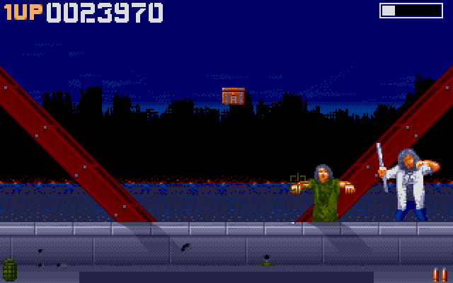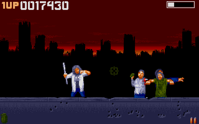 Zombie Apocalypse is a mouse controlled shoot-em-up where the goal is to kill as many zombies possible before you run out of energy. In every level you have to kill a certain number of zombies to be victorious. Some zombies that appears will throw hand grenades at you. Left mouse button is for normal fire and the right one is for throwing grenades. Ammo is limited but boxes with extra ammo will drop from the sky now and then (red boxes for bullets and green ones for grenades).