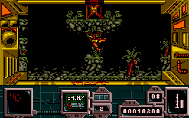 Zone Warrior is a side-scrolling platform game with exploration and shooting elements. It consists of five levels: Prehistoric, Egyptian, Medieval, Japanese and Future zones. Various enemies stand in the way, fitting the respective time period: dinosaurs and cavemen in prehistoric times, pharaohs in Egypt, robots in the future.