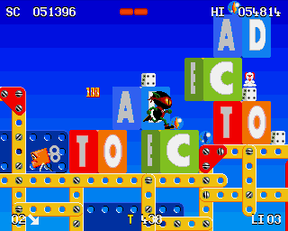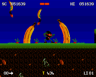 Zool is a fast-paced side-scrolling platformer. The protagonist can run, jump, climb walls, and shoot enemies. Power-ups for Zool are scattered across the levels. These include life-spending hearts, smart bombs, shields, more powerful jump-skill and a twin Zool. This "twin" makes imitates the original's motions a few seconds after he performs them.