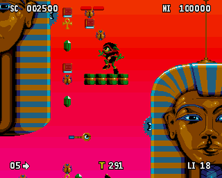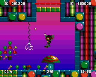 Zool 2 is a platform game where you control the titular "Ninja of the Nth Dimension" (or his girlfriend, Zooz, who can complete each level in a slightly different way) as he rampages through a variety of levels, collecting countless tasty treats, shooting any enemies that he encounters and finding bonuses (there's a variety of special power-ups Zool can find - for example, a bomb that follows him and can be blown up at any time to remove on-screen enemies, or a temporary invulnerability). New to the sequel is Zool's ability to scale walls and his new spinning attacks.
