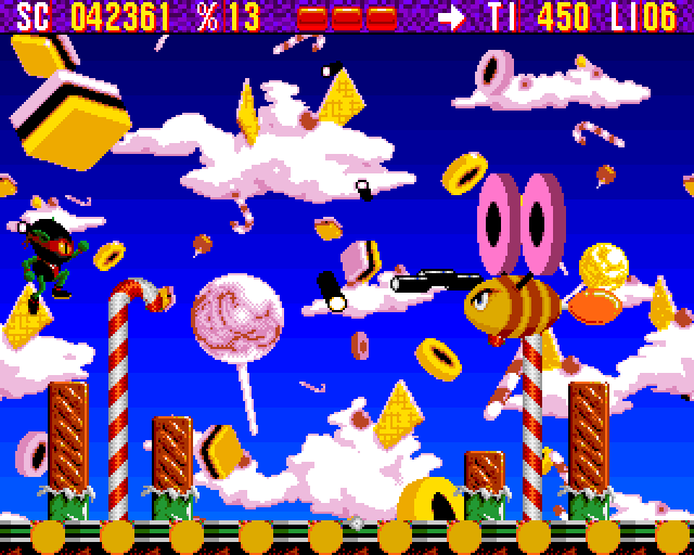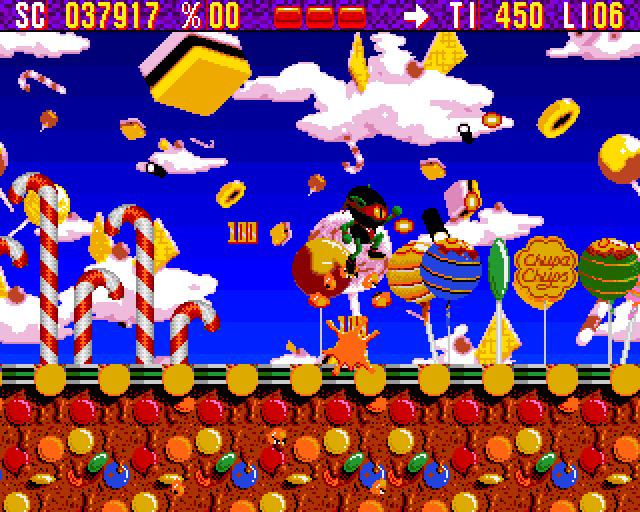 Zool is a fast-paced side-scrolling platformer. The protagonist can run, jump, climb walls, and shoot enemies. Power-ups for Zool are scattered across the levels. These include life-spending hearts, smart bombs, shields, more powerful jump-skill and a twin Zool. This "twin" makes imitates the original's motions a few seconds after he performs them.
