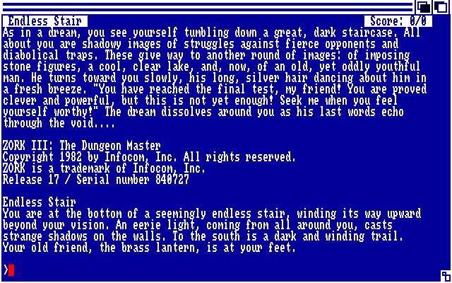 Zork III: The Dungeon Master is a text adventure game. You read descriptions of rooms and then interact with the game by typing commands.