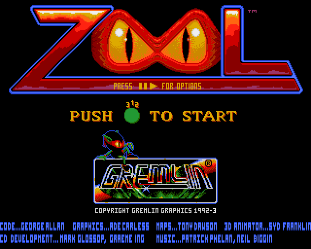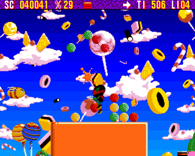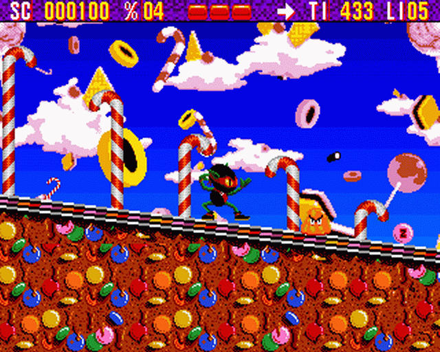 Zool is a fast-paced side-scrolling platformer. The protagonist can run, jump, climb walls, and shoot enemies. Power-ups for Zool are scattered across the levels. These include life-spending hearts, smart bombs, shields, more powerful jump-skill and a twin Zool. This "twin" makes imitates the original's motions a few seconds after he performs them.
