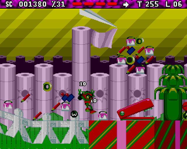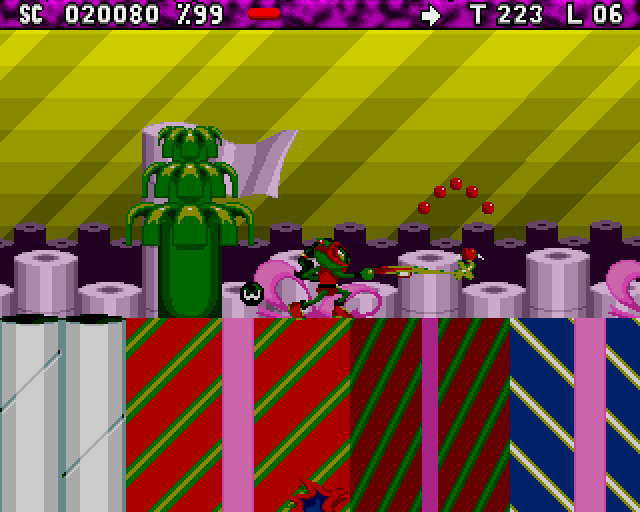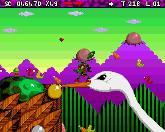 Zool 2 is a platform game where you control the titular "Ninja of the Nth Dimension" (or his girlfriend, Zooz, who can complete each level in a slightly different way) as he rampages through a variety of levels, collecting countless tasty treats, shooting any enemies that he encounters and finding bonuses (there's a variety of special power-ups Zool can find - for example, a bomb that follows him and can be blown up at any time to remove on-screen enemies, or a temporary invulnerability). New to the sequel is Zool's ability to scale walls and his new spinning attacks.