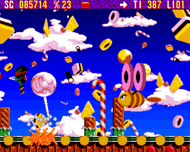 | description | Zool is a fast-paced side-scrolling platformer. The protagonist can run, jump, climb walls, and shoot enemies. Power-ups for Zool are scattered across the levels. These include life-spending hearts, smart bombs, shields, more powerful jump-skill and a twin Zool. This "twin" makes imitates the original's motions a few seconds after he performs them. |