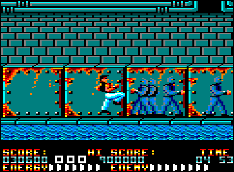 The Opponents in your battle for supremacy are four types of Evil Ninja star-throwing Assassins whose skills are manifold and dangerous. Also out to spoil your day are Acrobatic Women Warriors and vicious Guard Dogs. At the end of each level you must overcome the Ninja Master in order to progress - some examples of these superhuman villians are: A fire-breathing Fat Man, an Armour Clad Giant and he Green and Gruesome Giant Ninja. - who has a disconcerting habit of suddenly multiplying into an army! — Cassette cover
