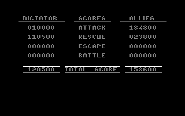 In one player mode there are three skill levels, harder modes resulting in faster movements and the computer opponent gaining in intelligence. In two player mode one player controls the usual side whilst his opponent will control the Dictator's forces. This game was notable for using synthesized speech (courtesy of Electronic Speech Systems, then of Berkeley, California). Known for its deathly scream (also heard in Epyx's Impossible Mission), laughing, "I'm hit", "Medic", "Hey! Don't shoot me" and "You can't hurt me" in the game.