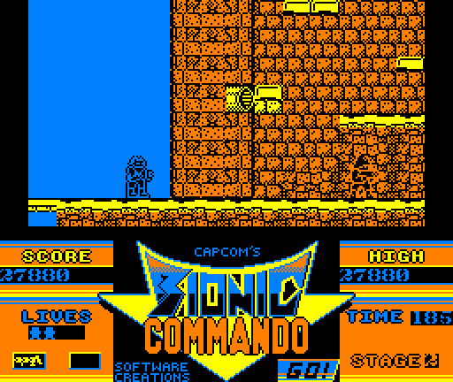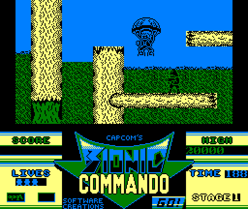 Bionic Commando, released in Japan as Top Secret (Japanese: トップシークレット, Hepburn: Toppu Shīkuretto?), is a 1987 action platform game released by Capcom for the arcades. It was later released for several home computers (ported by Software Creations and published by Go!). Capcom later produced a home version for the Nintendo Entertainment System, also titled Bionic Commando, that was drastically different from the original arcade game. The game was advertised in the United States as a sequel to Commando, going as far to refer to the game's main character as Super Joe (the protagonist of Commando) in the promotional brochure, who was originally an unnamed member of a "special commando unit" in the Japanese and World versions. The protagonist of the game is a commando equipped with a bionic arm featuring a grappling gun, allowing him to pull himself forward or swing from the ceiling. The series is notable for being one of few instances of a platform game in which the player cannot jump. To cross gaps or climb ledges, the hero must use his bionic arm. This was the first game to feature a grappling gun/hook, which later appeared in games such as Earthworm Jim and Tomb Raider.