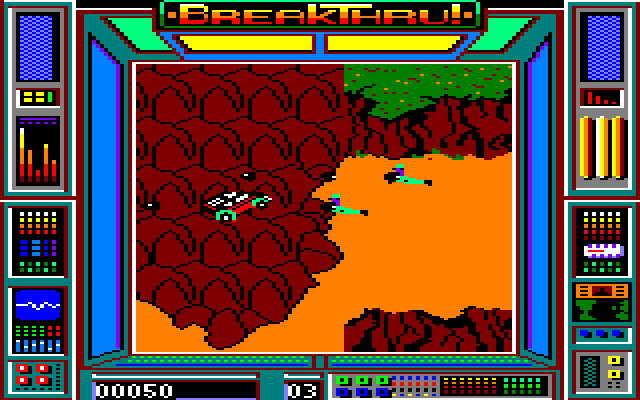 Secret fighter plane PK430 has been stolen from your country, and it is up to you to get it back. You will drive a buggy equipped with a gun and "BreakThru" five different enemy strongholds. On your way you will encounter obstacles such as land mines, rocks, soldiers, jeeps, flamethrowers, tanks, trucks, armored vehicles, and helicopters.
