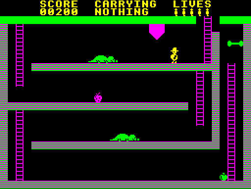 Chuckie Egg 2 is the sequel to 1983 hit computer game Chuckie Egg. Released in 1985 and featuring the same lead character, Henhouse Harry, the game took players beyond the single-screen format of the original into a large factory. Here, Harry had to assemble a toy-carrying chocolate egg from its constituent parts (sugar, milk and cocoa powder) and deliver it to the dispatch lorry. On completion the quest restarted, with more monsters and an alternative toy.