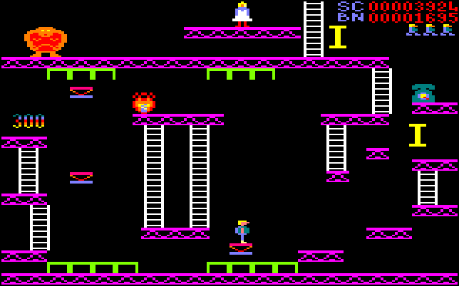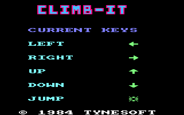 "CLIMB-IT" has 4 magnificent screens of superb graphic action in solid machine code. You are a heroic young man who has to rescue his girlfriend who has fallen in to the clutches of a giant monkey. To reach your sweetheart you must climb ladders, take rides on lifts and conveyors, avoiding barrels, fires, pies and bouncing beams. On reaching the forth screen you have the chance of rescuing your beautiful girlfriend. — Cassette cover