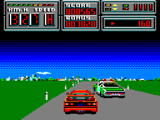 At last the amazing follow up to one of the most sucessful games of all time! This time you're at the wheel of the fabulous ferrari F40 and in a race against time in a bid to smash a stolen car racket - the only problem is the guys involved in the racket are corrupt policemen! As you go tearing through four states of America in search of the corrupt police. You will also have problems with the honest road cops who don't appreciate the sight of a Ferrari F40 crossing their state at 200 miles per hour... But, it ain't that easy... You must plan our route carefully from the maps of each state which are displayed on screen and which show the actual American freeways that you will travel on - be careful, the shortest routes aren't always the easiest as the sight and sound of a blue flashing light will soon make you relize. Your Ferrari is furnished with the latest radar which will enable you to detect police road blocks which may have been set up to catch you, therefore keep an eye on the freeway junctions as you may be forced to change your route! With 360 degree spins, car chases, realistic 3D road junctions, hills, road blocks and realistic mapped highways, not to mention superb 3D graphics. Crazy Cars II is here to set new standards in road racing. Don't just take our word, test drive a copy today! — Cassette cover