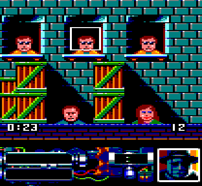 In this side-scrolling platformer, the player controls Darkman, a superhero who can jump, kick and punch, as well as swing from a rope during action sequences between levels. In each level, Darkman disguises himself as the boss of the level, whom he must defeat before the time limit elapses. Tying into the plot of the film, Darkman wears masks of various gangsters who are responsible for his disfigurement, but his disguise dissolves after being exposed to sunlight for too long. The character changes into a different member of the evil gang in each level, taking on their attack moves as well as their face.