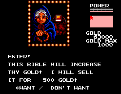 There is a password save feature in this game. At the beginning of each area, you can enter a cave where a woman tells you what the password is, but if you die in the course of your quest, the password will already be revealed. By entering this password, you will be able to begin the game from the opening of the valley (if you get that far) with all your possessions intact.