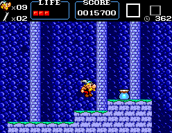 In seven rounds, you can play either with Asterix or Obelix, and in the bonus stages (accessible when you collect fifty bones in a single round), you control the little Dogmatix. The heroes can jump, punch, swim, throw obstacles, grab vines or ropes and they have distinct moves. Obelix moves slower, but is able to manipulate objects, while Asterix has much more speed. Both characters can be played alternately according to the level. In the two-player mode, you each choose a character and clear areas in turns.
