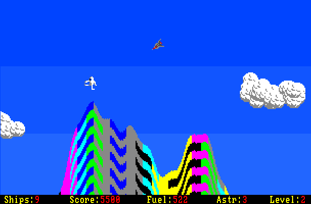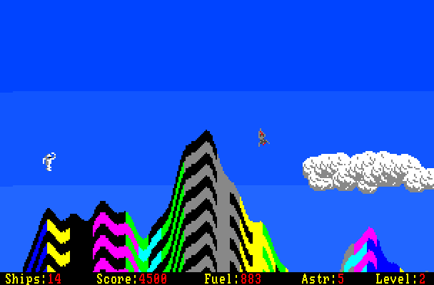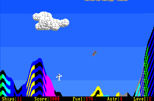 The gameplay of this game is similar to Thrust: the most grave obstacle is gravity which may change from level to level. It causes the ship to steer into a certain direction and the player needs to counter steer so it does not ram into the environment. The player can freely rotate the ship and use the thrust to get a boost. The gun is used to destroy alien turrets which shoot at the ship and are mostly stationed near the astronauts. The fuel reserve gets drained when the thrust is used or if the shields have to fend off an enemy shot - reaching zero causes the loss of a life.