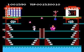 Popeye must win the love of Olive Oyl in three different scenarios while avoiding the nasty Bluto. His main weapon against this relentless brute are the cans of spinach that appear at the beginning of each screen.