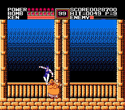 This is a platform "beat-'em-up" game based on the animé series Hokuto no Ken. According to the story mentioned in the manual, Kenshirou, the main character, has to save the people from the evil Emperor Heaven. The game itself, however, features no story whatsoever, but a lot of platform action instead. You have to run quickly through the levels (there is a time limit), punching and kicking your enemies, causing them to fly away or to explode, occasionally meeting a boss, visiting secret areas behind doors and collecting various power-ups.