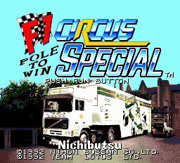 F1 Circus Special is a Formula 1 racing game. Players can choose between a world championship mode, which follows the path of one driver through the game's available courses in a linear fashion; a test drive mode, which allows players to choose any course as well as change rules and conditions (e.g. the amount of damage inflicted); and a time attack mode for competing against each other.