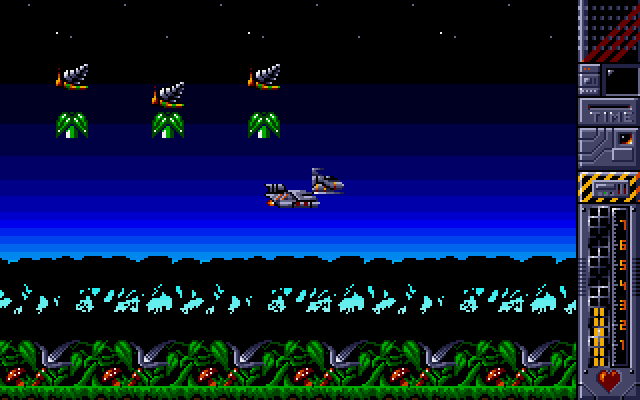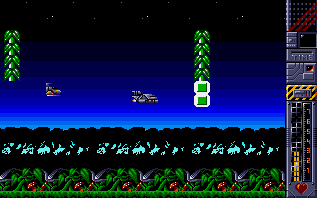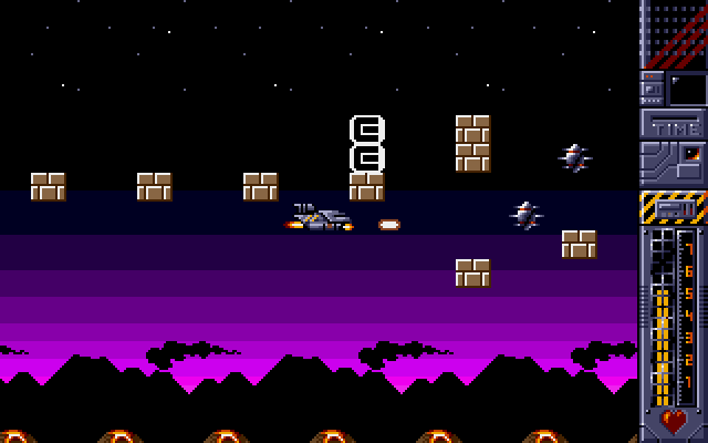 In Outzone the player takes control over a support space ship which has to aid a safety unit which has to travel through the dangerous outzones. The 28 levels are basically a big escort mission: in order to to protect the steadily moving ship, the player has to destroy all opposition waiting ahead in the usual shooter way. However, there are also blocks in the way which need to be destroyed by ramming them into each other. When they are destroyed in the correct way, they reveal power ups like new weapons, weapon upgrades, life energy, or shields. In order to keep the ship from crashing into non-destroyable blocks, the player has to connect to the ship and change the direction it steers to. When connected, the players own ship can't shoot.