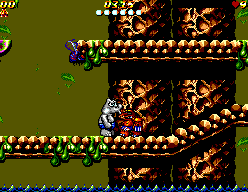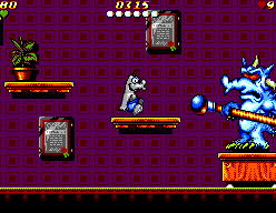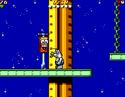 Picking up jelly babies, blasting enemies and collecting papers gives points and raises Bruno's score up to a fixed value of 9,999 pts. There are several entrances to secret rooms hidden in the five worlds. But, unlike the Genesis-version, the rooms are quite small and basic and there is no 1,000 point reward by completing them. On the whole there are two different tunes backing your journey through the game: one for the stages and one for the boss enemies. The varied background music and sound effects of the Genesis-game are completely missing, as is one entire world: The Garden.