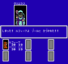 Monster Maker: Nanatsu no Hihou (translated "Monster Maker: The Seven Sacred Treasures") is an RPG released only in Japan for the NES/Famicom. It's an excellent, unique game that RPG fans will probably really enjoy. It has a playing card theme to the graphics that gives it a unique look. Dungeons are covered in playing cards. You flip over cards as you move through the dungeon and see what's underneath. The game mechanics are unlike anything else I've played. The spell system is unique, there is a monster summoning system, a lot of playable characters, and a good challenge level. Give it a try and hopefully you'll like it as much as I do. The goal of this faq is to guide you to the end of the game even if you don't know Japanese. I uploaded maps to gamefaqs.com as separate files, and I will be assuming that you're using these when I'm giving directions, although I commend you if you map the game yourself.