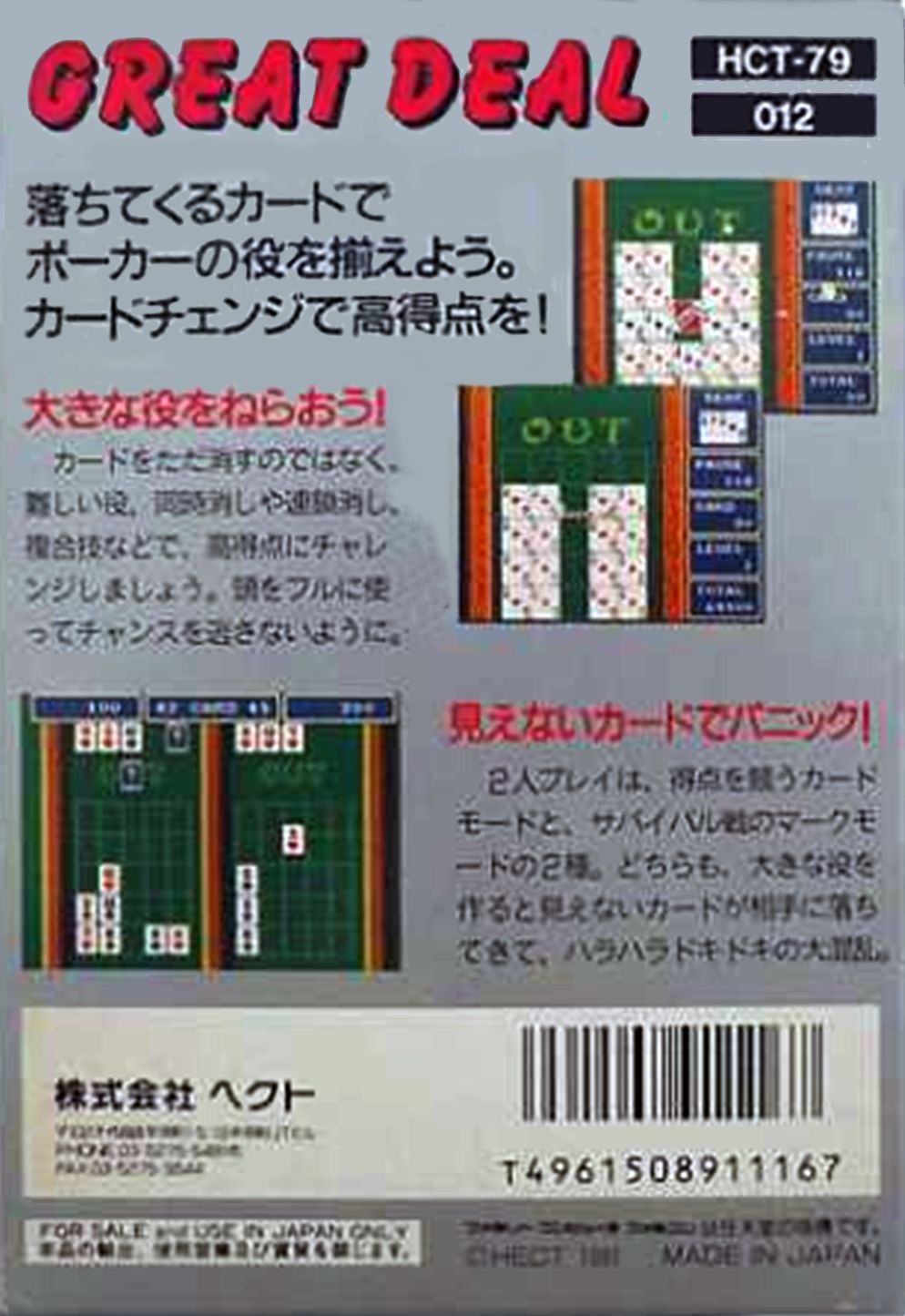 | description | Great Deal (グレートディール) is a poker game, published by Hector, which was released in Japan in 1991 for the Nintendo Famicom. |