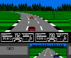 Race America is a 2-car cross-country racing game. Either 2 players can compete on the same screen, or the computer can control the second player. The game provides eight colorful opponents to race against, each of whom is supposed to have distinct advantages in a race. Each race begins from a side-scrolling perspective as the 2 competitors speed out of the gate. After a certain distance, the perspective shifts to third person and the driver in the lead occupies the top half of the screen while the driver in second is relegated to half of the lower screen. Occasionally, the game also employs an overhead view. To add to the challenge, the game's cars have 6-speed manual transmissions which players must shift using the control pad, but not while pressing the gas button.