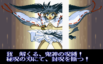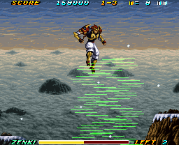 In Kishin Douji ZENKI: Battle Raiden the player takes the role of Zenki. At first, and occasionally through the game, Zenki will be in his powered down form where he can only punch, jump, and dash. After Chiaki recovers her bracelet, or regains her concentration, or whatever she needs to do at the time, she can transform Zenki into his powered up form. In this form Zenki deals more damage and has a much longer list of attacks that get added to as the game progresses, such as a pillar of energy, an electrified punch, and a dashing attack. By picking up scrolls Zenki can do a powerful Rudora attack to all enemies on screen, but this attack damages Zenki as well.