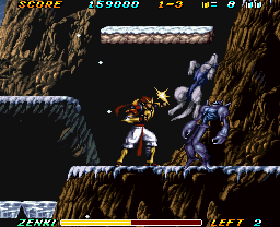 To complete platforming levels Zenki will have to make it to the end of the level while occasionally finding hidden stone monuments that, when destroyed, will drop items as well as alter the level or remove obstacles, allowing Zenki to pass. After a stage's first platforming level is a midboss fight, and after the second platforming level is the boss fight proper.
