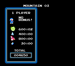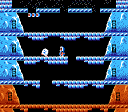 In Ice Climber one or two players need to climb their way to the top of 32 different mountains. Each mountain is broken up into eight levels of platforms along with a bonus stage at the top. Attempting to stop the player from making upward progress are different creatures ranging from polar bears to condors, as well as treacherous landscapes with falling icicles, moving platforms, and icy floors. To help out, the players have a weapon, a mallet, which can be used to knock out enemies as well as bust away bricks in the platforms to provide some room to jump up to the next level. When the player finally reaches the top, it's time to move on to the next, more difficult level.