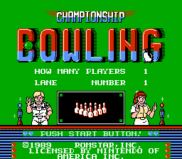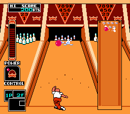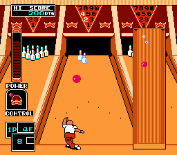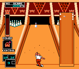 After picking a lane (5 different designs), a character (4 different characters), and the weight of the bowling ball they will be using, the player is placed on the lane. To bowl the player first picks the location that the bower will bowl from and then, using the ‘Control’ panel, the player must time it correctly to stop the ball at the desired angle and finally, time it correctly to stop the ‘Power’ bar at the desired power. The power, and the weight of the ball determine how much effect the control has. Up to four players can play using the NES Four Score accessory with all players taking turns to bowl.