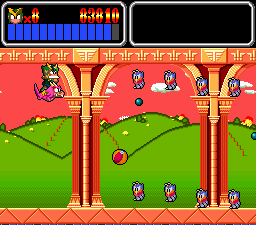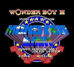 Wonder Boy III: Monster Lair is a quite different game to most of the games in the Wonder Boy series. You play a green-haired dude who must attack the invaders that attempt to collect weapons and use them to destroy the land. The game starts out like a simple platform game, but it's just when Wonder Boy enters the skull further on that the game is transformed into a shoot 'em up, so basically the gameplay consists of action and shooter scenes.