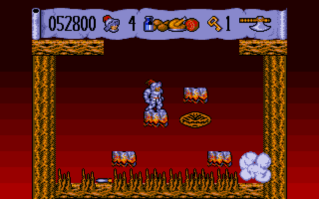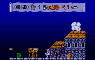 Like so many brave men before him, Prince Clumsy has been lured into a tough adventure to save the woman of his dreams. The route to the castle in which her ugly sister has imprisoned her is treacherous and goes both indoors and out. You're armed with a dagger to face the many henchmen infesting the areas. Bread and ale can be collected to restore your health, and there are lots of points bonuses on offer. Less pleasant are the super glue, ball & chain (ironic given that he's chasing a potential wife) and poison.