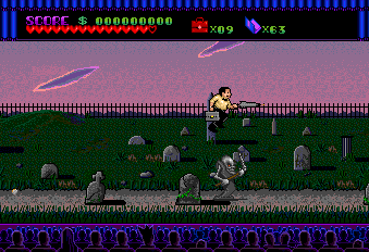 Like most other Addams Family incarnations, this is a side-scrolling action game. Tully Alford's only weapon is an umbrella that fires energy shots at enemies. Tully can also jump and duck to avoid enemy blows. The game world consists of a "hub" area, the hall of Addams Family mansion, and many rooms, most of which are locked in the beginning of the game. The gameplay consists mainly of exploring the accessible rooms and collecting keys that are needed to open other doors in the process. Some of the rooms contain treasure and power-ups, while others are infested by monsters or require the player to defeat a boss enemy in order to advance.