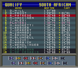 At beginner any team can be chosen and the player will start all races without having to qualify. There's no machine setting, and one other difference is that during the actual race the vehicles do not collide with each other. In the expert one, there's the qualifying session consisting of nine laps. It is also possible to save data, among other differences.