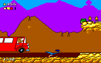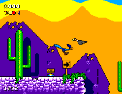This is a platform game starring Looney Tunes famous Road Runner(who you control) and nemesis Wile E. Coyote. Road Runner can jump, eat birdseed to replenish life and run, of course! Holding the D-pad down speeds him up. The clock is ticking and if you run out of time a try is lost, collecting stars adds time to the clock.
