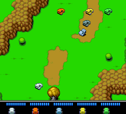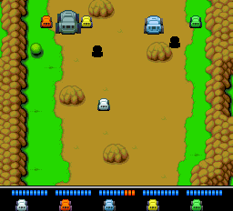 Damage can be sustained by driving over environmental hazards (pits, traps, bombs, etc.), failing to move the car forward in time (if the screen scrolls while the player-controlled car is at the bottom, it takes damage), being hit by the many enemies encountered in the game (which include a wide variety of wild animals, humans, fantasy creatures, monsters, etc.), or being hit by a competing car. Cars have the ability to jump over obstacles or enemy fire, avoiding damage.