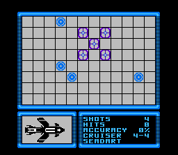 Battleship for NES and Game Gear is an adaptation of the pen and paper battleship game that puts its own spin on the concept. The ship lineup is unique in designations and sizes, the grid is 12 by 8 instead of the standard 10 by 10, and only one shot can be made per turn regardless of if it hits or not. Major changes from the classic game are a level structure and special weapons. The game contains eight larger levels, consisting of five sub-stages each, with passwords awarded after a successful battle. Each main level adds a new gameplay element: either a new ship (submarine and carrier are not available from the start) or a new weapon for an existing ship. The special weapons fire many missiles many points across a set grid, for instance in an X pattern. The bigger the ship, the larger the grid area. Each ship can only shoot its special missile once per game and if the ship carrying the weapon is destroyed then the weapon becomes unusable. Later stages add reconnaissance weapons: a sonar that can only detect the submarine and an aerial recon that can spot any ship.