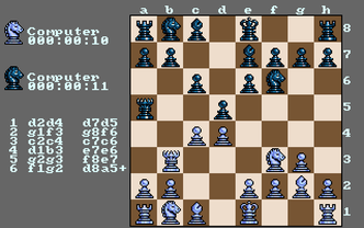 Checkmate (or Chess Champion 2175) is the successor of Chess Player 2150. Most basic options and displaying are the same like in the predecessor. Improvements are done in the strength of the chess engine (the authors claim over 2000 ELO for the program), the usage of extra RAM for additional deep searching, a bigger opening library, the possibility to extend the opening library by the user and some improvements to the user interface.