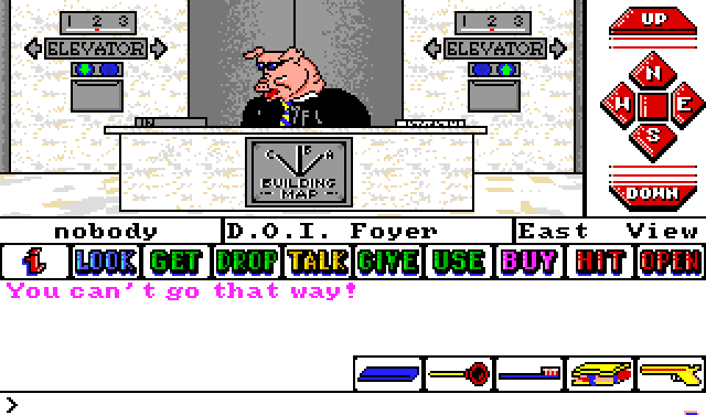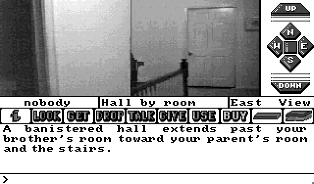 Dream Zone is a first-person adventure game. A mad scientist's elixir has turned the protagonist's dreams into reality; while in this dream state, he must fight to stay alive, leave that forsaken place, and return to the real world. The game is composed out of still screens, and the player can move between them by selecting four directions. The interaction is performed either by typing text commands or by selecting verbs bound to function keys. Among those verbs are traditional "Look", "Talk", as well as the more unorthodox commands such as "Buy" or "Hit".