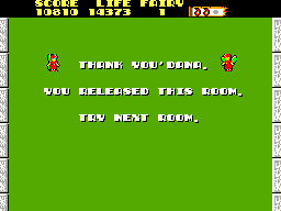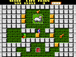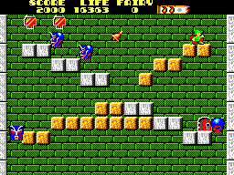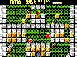 Solomon's Key is a platform game with both action and strategy elements. On each level your goal is to retrieve a key which can then be used to unlock the exit. To help out, you have a magic wand which can be used to create and destroy blocks (though some blocks can't be destroyed). In order to reach the key you will need carefully to arrange the blocks on the screen so you can jump your way around safely. Wandering around each level are a variety of enemies which will cause you to lose a life if you're caught. Some creatures can be killed by destroying the block they are standing on, others must be dodged. Hidden bonuses and magic can be found on many of the levels, sometimes even hidden in blocks. Some treasures give you bonus points, others can form magic spells to help deal with the enemies. To make the game more difficult, each level has a time limit in which it must be completed.