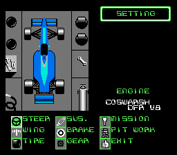 A total of 15 courses are on offer, and there is a World Championship mode, as well as a "Constructors" mode for one or two players where the player can take the role of team manager while the computer does the actual racing. The Famicom release also adds a Time Attack mode for practicing and perfecting each course.
