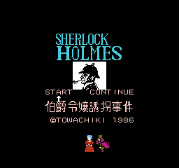 Sherlock Holmes: Hakushaku Reijou Yuukai Jiken ("Sherlock Holmes: The Kidnapping of the Count's Daughter") is an adventure game with action elements starring Sir Arthur Conan Doyle's famous detective Sherlock Holmes. It is the first of three such Famicom games from obscure Japanese publisher Towa Chiki, the next two being Meitantei Holmes: Kiri no London Satsujin Jiken and Meitantei Holmes: M-Kara no Chousenjou.
