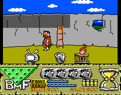Part 1: Painting the walls of your living room. To go to the bowling alley before it is closed Fred has to paint the walls as quickly as possible. To paint the walls Fred uses the tail of a living squirrel. Pebbles tries to leap out her playpen and starts crawling around and starts scribbling on the walls. If Fred wants to put Pebbles back in the playpen then he has to drop the squirrel, that immediately starts wandering off. When Pebbles is back in the playpen Fred has to chase the squirrel and dip its tail in the paint again.