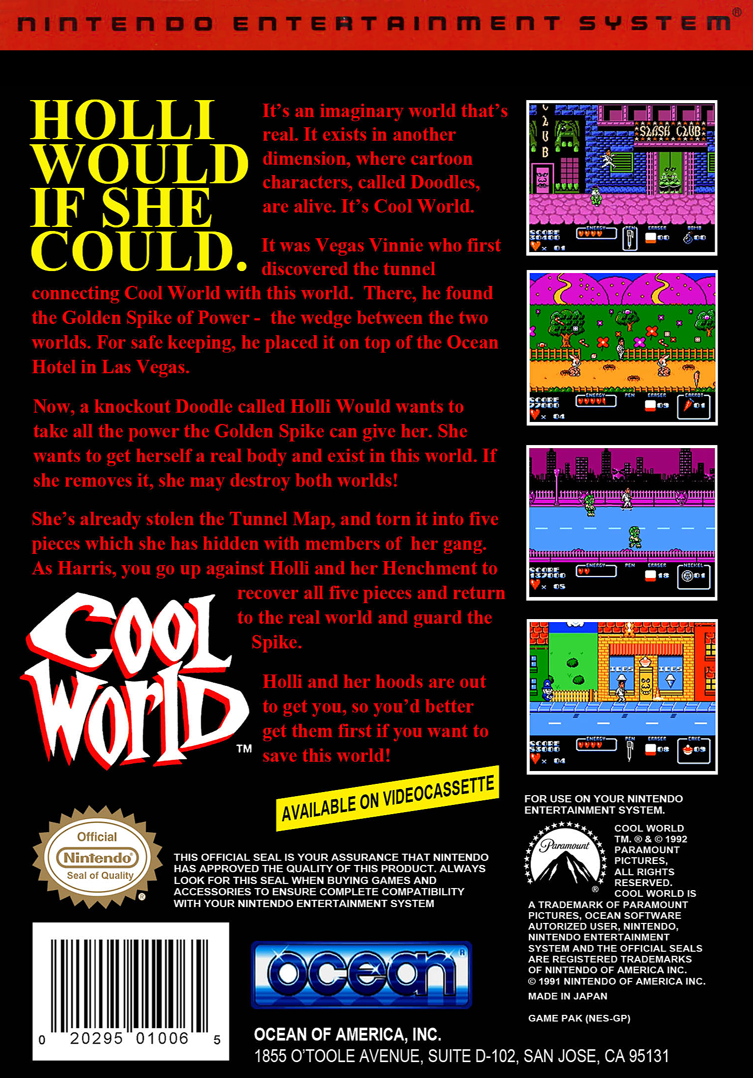 | description | A game based on the live action/animation film Cool World. The player controls Frank Harris, who must prevent Holli Would from entering the real world. |