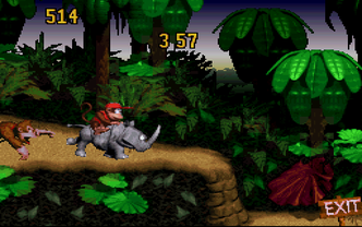 The actual game consists of a few select levels from Donkey Kong Country with the addition of a point counter and a few minor tweaks to encourage scoring, the goal being to score as many points as possible. The tree house and banana cave at the start of Jungle Hijinxs have been disabled and all of the Animal Tokens in the early levels have been replaced with banana bunches, making it impossible to reach the bonus round without the usage of a cheating device. The player is also given 50 starting extra lives instead of the 5 as in the original game. The game has a time limit of five minutes, which is displayed at the center of the screen. After the allotted time, the game freezes.
